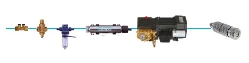 Pressurization occurs immediately after filtration via a High-Pressure Pump Unit. This system boosts incoming mains water from 3 bars to 60 bars for injection into the misting circuit.